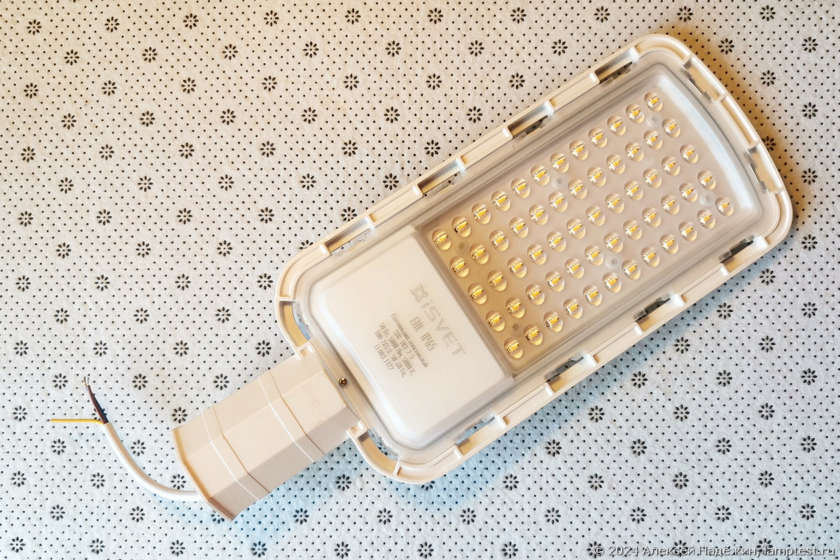 В светильнике установлено 60 светодиодов. Судя по всему, светодиоды одноваттные и работают они в щадящем режиме (0.71 Вт на светодиод). При таком режиме работы светодиоды имеют большую эффективность (больше света при той же мощности) и служат гораздо дольше за счёт меньшего нагрева.