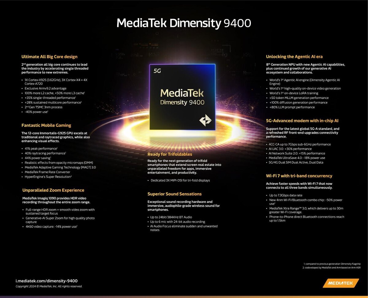 MediaTek представила Dimensity 9400, высокопроизводительную SoC для лучших смартфонов нового поколения, сообщает ComputerBase. Чип производится по 3-нанометровому (нм) техпроцессу TSMC второго поколения, в процессоре используются только «большие» ядра Arm, включая ядро Arm Cortex-X925, а также новая графика Immortalis-G925 и NPU 8-го поколения. По данным MediaTek, первые смартфоны с Dimensity 9400 будут представлены и доступны в четвёртом квартале текущего года. Основным в процессоре MediaTek Dimensity 9400 является ядро Arm Cortex-X925 с тактовой частотой до 3,62 гигагерц (ГГц). Это на 220 мегагерц (МГц) больше, чем у обновлённого Dimensity 9300+, который, в свою очередь, был на 150 МГц быстрее базового Dimensity 9300. По информации MediaTek, Dimensity 9400 на 35% превосходит Dimensity 9300 в однопоточной производительности. В частности, этому способствует в два раза больший объём кэш-памяти 2-го уровня и на 50% больший объём кэш-памяти 3-го уровня. Помимо Cortex-X925 процессор включа