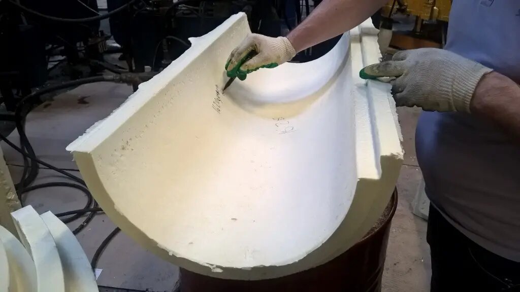 - Неправильное количество секций скорлупы — многие производители заказывают большие диаметры двухсекционных пресс-форм — от 530 и выше. Но чем больше дуга, тем больше разница в плотности изделия. В нижней части она может быть 60 кг/м³, а на краях 47-50 кг/м³. Следовательно, чем выше разница в плотности, тем выше внутреннее напряжения готового изделия и тем больше вероятности, что её «поведёт». Необходимо заливать изделия 65 кг/м³ или даже 70 кг/м³, чтобы края изделия были плотностью 60 кг/м³.