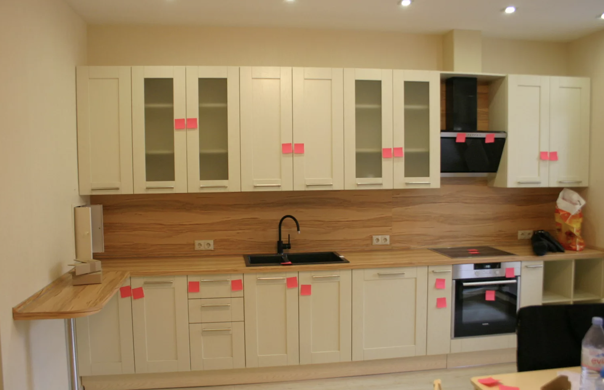 При заказе конструируемой кухни нужна точность до миллиметра. Именно поэтому действительно ответственные фирмы производят два-три замера помещения перед изготовкой – намного дешевле исправить свои собственные «косяки» на стадии производства, нежели краснеть перед клиентом и держать ответ за то, почему именно эта плашка не подошла к стене.