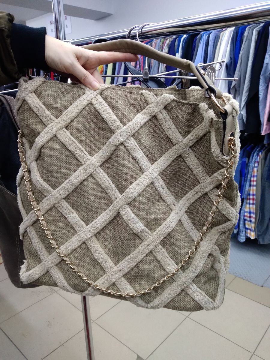 Здравствуйте. А не попугать ли вас, читатели, эксклюзивом и эксклюзивными ценами? Я всё больше гуляю по скидкам, я берегу свое психическое здоровье и не смотрю секонд по максимальным ценам, я человек дерганый и нервный, я даже телевизор включаю только как монитор к компу. А поскольку в секонд в этот раз со мной ходил сын, то я рискнула, в надежде, что если мне поплошает, то сын меня вытащит из магазина🤪. Ну не должны быть такие цены в секондах, тем более иногда качество и бренд не подходят к слову эксклюзив. Покажу сумки, цена 5500 за кг. Это категория эксклюзив. А сумка мне понравилась, она вместительная, сшита из грубой ткани, полоски с небольшим ворсом, золотая цепочка в роли длинной ручки, а может просто для красоты. Чёрная, сумка из очень жёсткого кожзама. И вот эта превосходная сумка. Все лаконично и просто и швы как украшение. И по моему это натуральная замша или нечто очень похожее. Чёрная сумка с внешними карманами. Похоже на кожу, мягкая, в меру тяжелая. Не знаю как Майкл