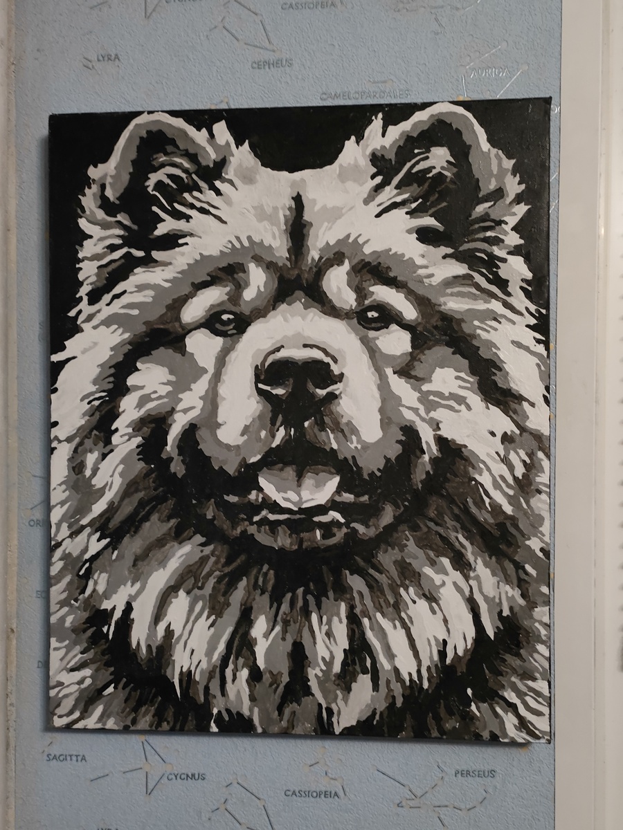 Давно я искала черного чау, ну или в стиле чб. При этом без разницы: живопись по номерам, алмазная мозаика, вышивка, вышивка бисером...Но...рыжие - есть, чёрных - нема. Хотя и по жизни так же. Чау-чау очень редкая порода, а уж чёрные - подавно. Вот теперь такая Валенсия у меня висит. По моему похоже.