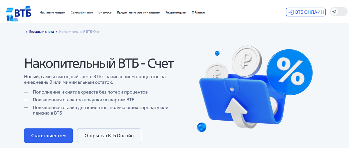 Выбрать лучший накопительный счет — задача не из простых. В 2026 году банки предлагают множество вариантов с разными условиями и процентами. Чтобы вам было легче определиться, мы сделали подборку лучших накопительных счетов с ежедневным начислением процентов. Здесь вы найдете варианты с выгодными процентными ставками, удобными условиями снятия и пополнения, а также полезными бонусами. В статье мы разберем, чем отличаются счета, и на что стоит обратить внимание при выборе. Все просто и по делу — чтобы ваши деньги работали на вас. Накопительный счет от ВТБ предлагает доходность до 22% (а по счету с минимальным остатком - до 24%) годовых для новых клиентов на первые три месяца. С четвертого месяца — от 15 до 19% годовых при разных условиях. Максимальная ставка сохраняется 3 месяца, после чего возвращается к обычной ставке. Проценты начисляются ежедневный или на минимальный остаток средств на счете. Счет можно открыть при оформлении бесплатной дебетовой карты ВТБ Альфа-Счёт от Альфа-Банка