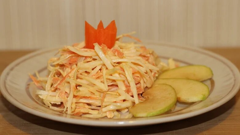 Ингредиенты: Капуста белокочанная 200 г Морковь1 шт. Яблоки 1 шт. Майонез по вкусу _________________________________________________________________________________ Энергетическая ценность: Калории100 ккал/100г Время подготовки: 20 мин. Время приготовления: 25 мин. __________________________________________________________________________________ Капусту тонко нашинковать. Слегка обмять руками. Морковь вымыть, почистить и натереть на крупной терке. Яблоко (кисло-сладкого сорта) вымыть, натереть на крупной терке. Смешать капусту, морковь, яблоко. Добавить майонез и перемешать.