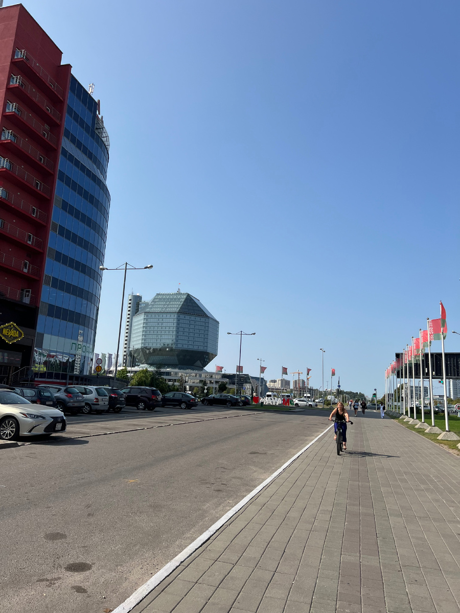 Посетить это место нам советовали абсолютно все. Поэтому когда мы случайно оказались рядом, решение было принято сразу - идем смотреть на город с высоты Национальной библиотеки Минска! Здание библиотеки имеет очень узнаваемый вид "белорусского алмаза". Такая сложная форма называется ромбокубооктаэдр. Перед входом в библиотеку установлен памятник Франциску Скорине - издателю книг и переводчику, внесшим значительный вклад в белорусскую культуру. Вход в библиотеку оформлен в виде страниц раскрытой книги, что добавляет оригинальности. Чтобы добраться до смотровой площадки, нужно обойти здание по периметру, так как центральный вход не ведет туда. Заблудиться не получится, есть указатели 👇👇👇 Обзорная площадка расположена на 23 этаже, и подняться на нее можно на панорамном лифте. Стоимость билета - 20 BYN с человека. Архитектура библиотеки действительно впечатляет 👇👇👇 Переходим на площадку по мостику 👇👇👇 Ограждение высокое 👇👇👇 На площадке открывается великолепный вид на новые райо
