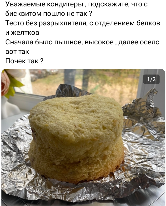 Иногда бывает так, что бисквит, ну совсем не получается. То не поднимается, то опадает, то похож на подошву от сапога. Всё потому, что в его приготовлении много тонкостей, хотя на первый взгляд и кажется всё просто. 🧁🧁🧁🧁🧁🧁🧁🧁🧁🧁🧁🧁🧁🧁 У этой девушки бисквитом беда и она просит совета: Уважаемые кондитеры , подскажите, что с бисквитом пошло не так ? Тесто без разрыхлителя, с отделением белков и желтков Сначала было пышное, высокое , далее осело вот так Почек так ? Выглядит он вот так 👇👆 Скорее всего недовзбили яйца, должна быть хорошая устойчивая пенка и взбивать лучше на не максимальной скорости, тогда пузырьки будут меньше и бисквит получится менее дырявый. И второе, возможно мало муки. Низ чуток поджарился, верх совсем бледненький, посмотрите на режимы выпечки или ставьте отпекаться чуть выше. 🍰🍰🍰🍰🍰🍰🍰🍰🍰🍰🍰🍰🍰🥙 Может быть всё, что угодно. Начиная от качества продуктов и заканчивая тем, что кто-то его случайно придавил и Вам не сказал. Это как без анамнез