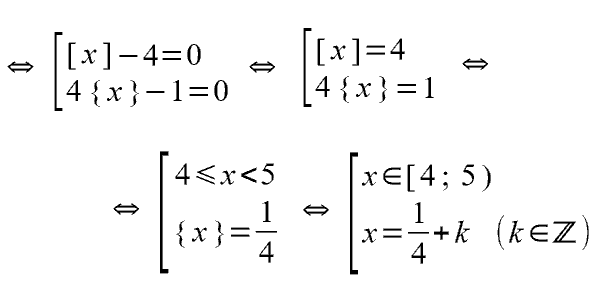 ([x] – 4)·(4{x} – 1) = 0 ⇔