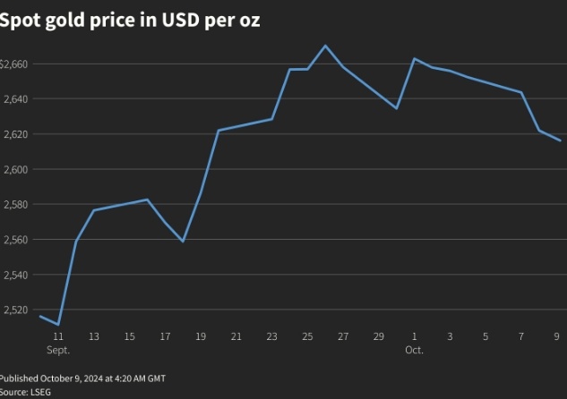 Снижение вероятности резкого сокращения ставки ФРС в ноябре и рост доллара ударили по драгметаллам В среду стоимость золота продолжила снижаться, демонстрируя шестую сессию падения подряд. Цена золота колеблется вблизи двухнедельных минимумов, достигнутых накануне. Это происходит на фоне охлаждения ожиданий более значительного снижения процентных ставок. Трейдеры переключили своё внимание на протоколы заседания Федеральной резервной системы и данные по инфляции. Стоимость золота на спотовом рынке упала примерно на 0,2% и составила $2617,79 за унцию к 11:45 по Гринвичу. Это стало самым низким показателем с 20 сентября. Фьючерсы на золото с поставкой в декабре остались стабильными на уровне $2636,20. «Сектор драгоценных металлов, похоже, разочарован после вчерашнего заседания Национальной комиссии по развитию и реформам Китая, которое усилило опасения относительно роста и спроса со стороны Китая в четвёртом квартале. Кроме того, золото сталкивается с возможностью менее агрессивного сниже