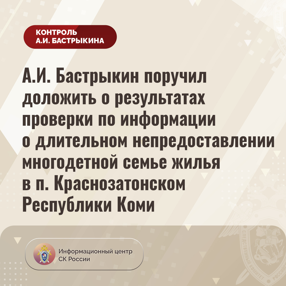 А.И. Бастрыкин поручил доложить о результатах проверки по информации о длительном непредоставлении многодетной семье жилья в п. Краснозатонском Республики Коми В Информационный центр СК России обратилась многодетная мать из Республики Коми, являющаяся инвалидом и супругой участника СВО, о длительном непредоставлении положенного жилья. В декабре прошлого года муниципальная квартира в доме по улице Хвойной в поселке Краснозатонском, в которой женщина проживала с супругом и тремя несовершеннолетними детьми, была полностью уничтожена в результате пожара. Однако до настоящего времени помещение непригодным для проживания не признано, равнозначной благоустроенной жилплощадью семья не обеспечена. Из-за непринятия мер женщина вынужденно сменила место жительства и стала арендовать малогабаритную комнату в общежитии. В СУ СК России по Республике Коми по поступившему обращению организована процессуальная проверка. Председатель Следственного комитета Российской Федерации Александр Иванович Бастрыки