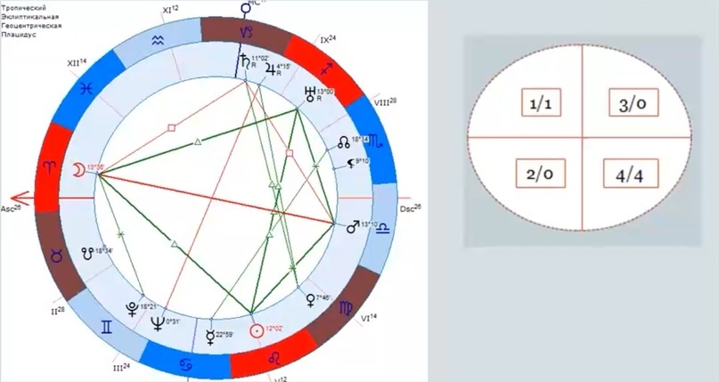 Сколько каких планет находится в этих смысловых квадрантах, что значит один один справа наверху это значит что всего планета одна, и это планета личностная, это Луна. Одна личностная планета Луна находится в верхнем восточном квадранте. Ниже мы видим запись 2.0, это значит, что там находятся две планеты, Нептун и Плутон, и они не личностные. Ну и аналогично, 4.4,в нижнем западном квадранте это означает что у нас там 4 планеты и все они личностные ну и наконец 30 опять-таки означает что там у нас уран юпитер и сатурн в верхнем западном квадранте. Исходя из этих данных, мы можем понять, где у человека максимальный потенциал в плане профессиональной реализации. Здесь видно, что он в квадранте 2.44, четыре личностных планеты.