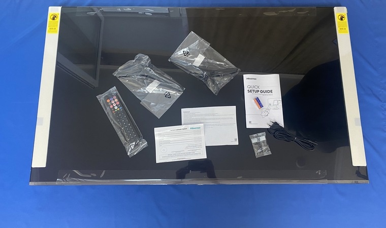 Телевизор Hisense 55e7nq pro поставляется в очень габаритной коробке из довольно прочного картона. Для того чтобы пользователю было удобно осуществить переноску, производитель сделал боковые вырезы на коробке. Так как ценник нового телевизора нельзя назвать бюджетным, то и внутри коробки телевизор очень хорошо зафиксирован при помощи пенопластовых вставок, которые не только фиксируют нижнюю и верхнюю часть, но и боковую. Кроме телевизора Hisense 55e7nq pro в комплектации имеется также две ножки из пластика, инструкция по эксплуатации, четыре болта, кабель питания, 2 батарейки ААА, пульт ДУ, гарантийный талон.