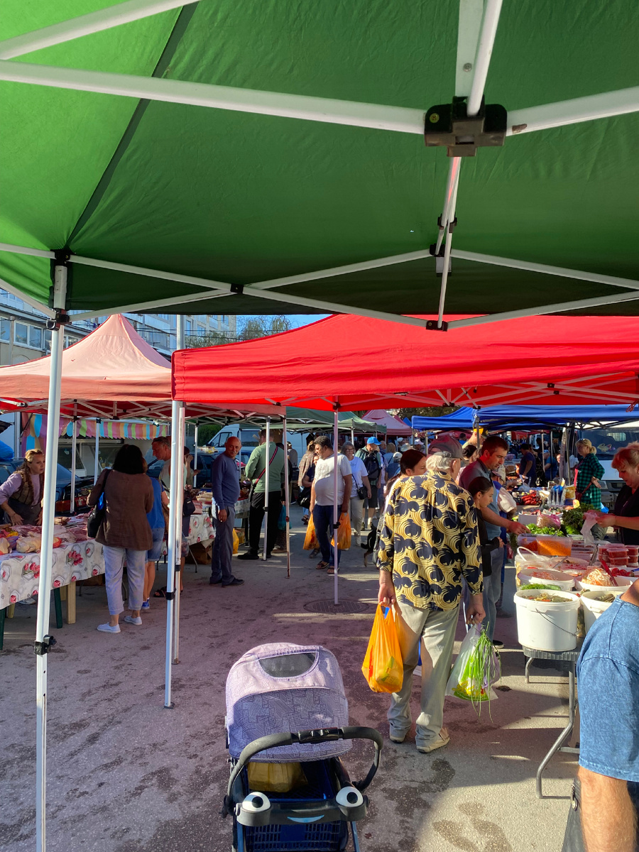 Еще несколько дней назад и тут и там раздавалось об этом довольно необычном событии. Почему необычном? Наверное потому что я на ярмарках особо и не бывала. Напротив, для местного населения это очень популярный способ времяпровождения. Вот и я решила, а почему бы не сходить узнать, что же там такое? Живу я в достаточно отдаленном районе, но уже проходя по частному сектору начала встречать людей с небольшими «тачками» для продуктов. При чем в 8 утра они уже возвращались обратно Ага думаю, я еще получается и запаздываю. Пора ускоряться! Ближе к центру уже начинает откровенно бросаться в глаза, что все с пакетами, тележками и так далее. Так что еще не дойдя до места, меня начал захватывать дух ярмарки. Пройти место, где проводится ярмарка невозможно. Все пестрит различными зонтиками, большим количеством людей и конечно прилавками с товаром. В воздухе царит атмосфера настоящего базара, как из детства. Жизнь кипит, все торгуются, занимают очереди, бегут - будто все закончится. Хотя такое