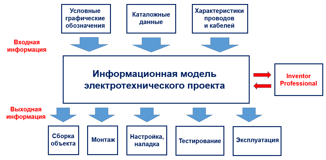 Представьте себе, что вы открыли схему, созданную в AutoCAD. Чтобы получить подробную информацию о компонентах схемы, необходимо дополнительно открыть перечень элементов. Для получения информации о проводах нужно открыть таблицу соединений, в который указаны характеристики проводов. В AutoCAD Electrical вся эта информация содержится в проекте. Графические образы компонентов дополнены каталожными данными (изготовитель и каталожный номер). Соединениям между компонентами назначены номера цепей, цвета и сечения проводов. На рисунке ниже представлена информационная модель электротехнического проекта. В качестве входной информации в проект добавляются условные графические обозначения (УГО) компонентов, каталожные данные для них, характеристики проводов и кабелей. Инструментами AutoCAD Electrical создается информационная модель, которая может быть связана и синхронизирована с 3D моделью Inventor. По данным информационной модели автоматически или полуавтоматически создаются документы для сборк