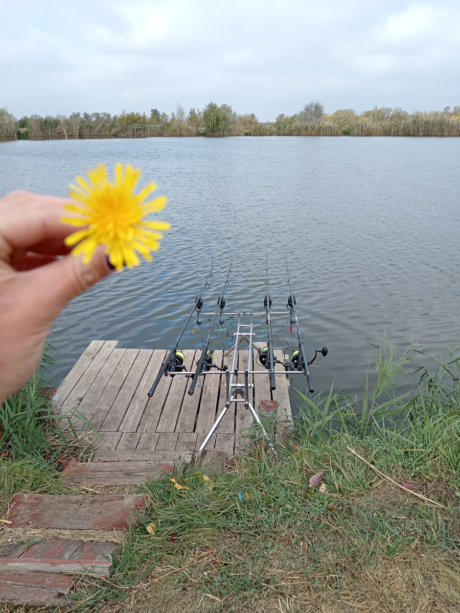 Резко так похолодало. Так то понятно 9 октября 2024 уже. Но пару дней назад днем плюс 20 было. А теперь холодно. Оделась я в свои одежды термо. И рванули на местный пруд Лакокраска. На дневную сессию. Шла по берегу увидела одуванчик. Так он меня порадовал. Обычный цветочек, а я их обожаю просто! Это конечно прекрасно, а вот поймается ли карп? Вот в чем вопрос. Место первая беседка. Слева и справа коряги. Вот туда на кораблике и завозили свои насадки. Пол дня уж прошло. И прям сон одолел. Прилегла в машине. И прям мечтаю как карп клюет. Из насадок, вафтерс С4 цитрус, силиконовый пеллетс мед, хотя мне он больше на вафтерс похож. Плавающая кукуруза. Была с утра так и не сработала убрали её. Заменили на бойл с попапом. И пошла я гулять по берегу и слышу Саня зовёт быстрее сюда. Я туда, к родподу, а там рыба клюнула ура!!! Подсак в руки и жду. Карп! Его видно. Красивый осенний карп. Сфотографировали его и отпустили. И ладно, что веса всего около 4 кг. Зато клюнул,