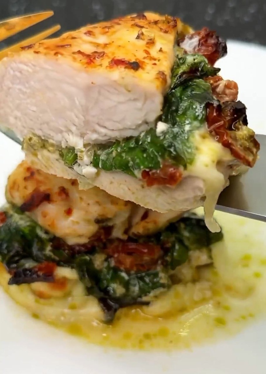 Быстро и просто приготовить куриную грудку для вкуснейшего ужина и приятно удивить близких таким угощением, вам поможет новенький рецепт. Действительно новинка. Интересно?) Тогда смотрите рецепт - В этом рецепте добавляется соус песто, рекомендую попробовать. Сразу расскажу пошагово, как готовить и насколько это легко, а затем количество ингредиентов. 1. Филе курицы промываем, промакиваем от лишней влаги салфетками. Разрезаем сбоку посередине так, чтобы раскрыть кусочек на две половинки. Не разрезаем две отдельные части, надо немного недорезать. 2. Раскрываем на доске и промазываем две половинки соусом песто. Затем на одну часть укладываем нарезанный кружочками сыр моцарелла, мелкие кубики помидора (свежий или вяленый) и промытые листья шпината. 3. Складываем разрезанное куриное филе, накрыв начинку свободной половинкой. Скрепляем, заколов зубочистками. Сверху обмазываем немного маслом и солим (специи по вкусу). Как на фото - 4. Разогреваем сковородку и укладываем эти филе с начинкой.