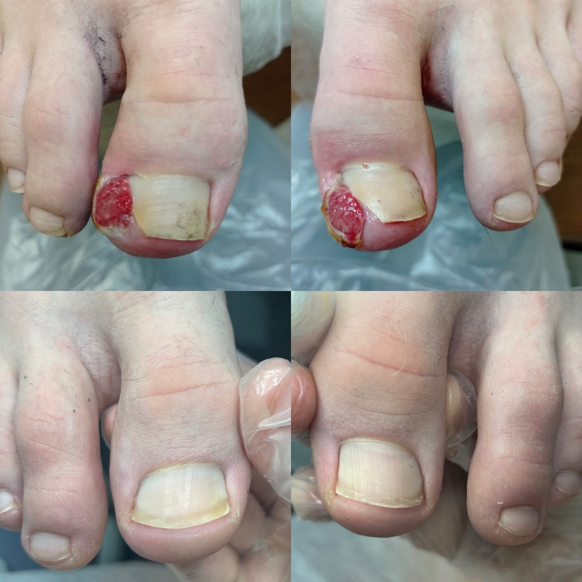 Вросший ноготь (онихокриптоз) - это распространенная проблема, при которой край ногтевой пластины врастает в мясистую ткань вокруг ногтя, что может вызывать боль, покраснение, воспаление и в последующем вызывать инфекцию. Эта патология чаще всего возникает на больших пальцах ног, так же может затрагивать и любые другие ногти. Причины вросшего ногтя 1. Неправильное подстригание ногтей: Обрезание ногтей слишком коротко или по неправильной траектории. 2. Ношение тесной или маленькой обуви: Обувь, которая плотно прижимает пальцы, создает давление на ноготь и вызывает их врастание. 3. Травмы ногтя: Удар или травма ногтя могут так же привести к врастанию. 4. Избыточная влажность: Чрезмерное потоотделение или длительное прибывание в воде могут способствовать развитию данного состояния. 5. Завал стопы: Когда нарушена биомеханика стоп. 6. Грибковые инфекции: Грибок ногтей так же приводит к деформации и врастанию ногтя. Симптомы вросшего ногтя - Боль и дискомфорт, особенно при ношении обу