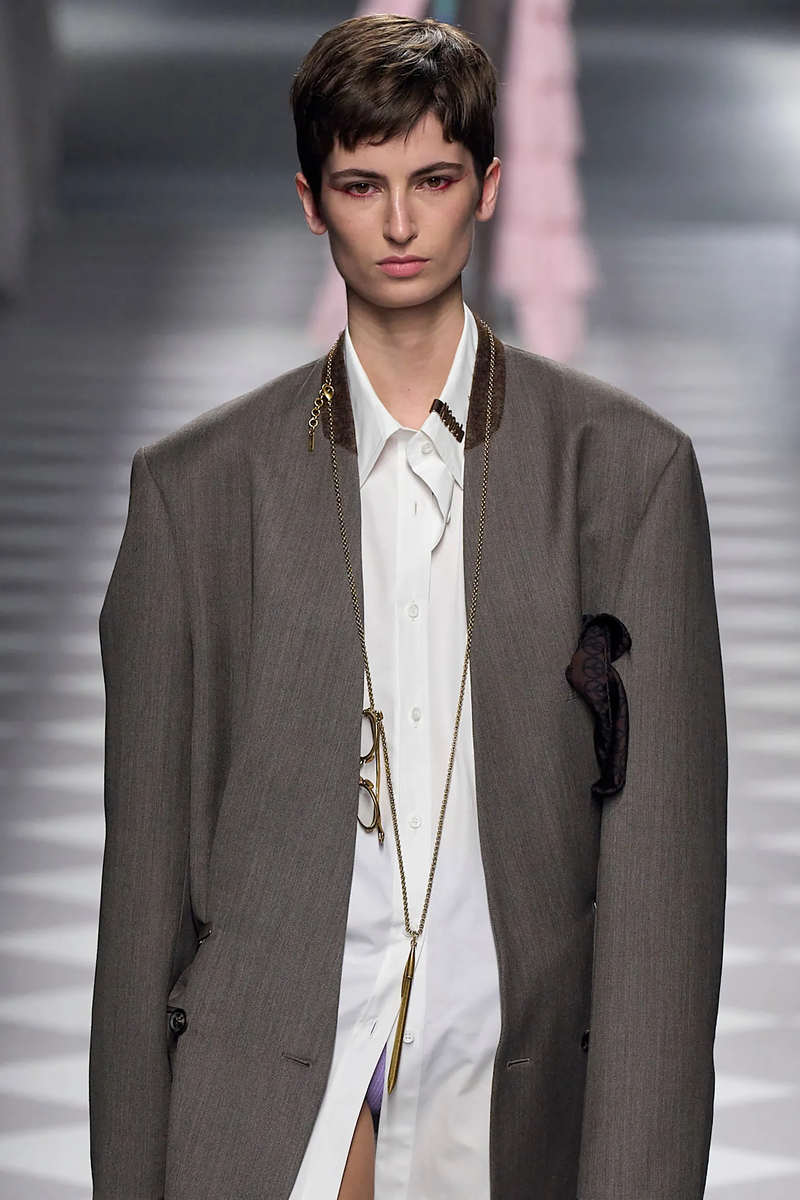 Tod's продемонстрировал, как создать элегантный образ с помощью классической белой рубашки с широкими рукавами и свободных брюк кофейного цвета. Завершающий штрих — жилет изысканной вязки. Благодаря расстёгнутым манжетам рубашки становится заметен её оттенок, близкий к белому. Он подчёркивает теплоту других предметов одежды, создавая андрогинный и утончённый образ. Туфли на каблуке и сумка через плечо с кожаным ремешком от итальянской торговой марки — идеальное дополнение к образу. Они помогут создать эстетичный аутфит в стиле рабочей одежды вне офиса.