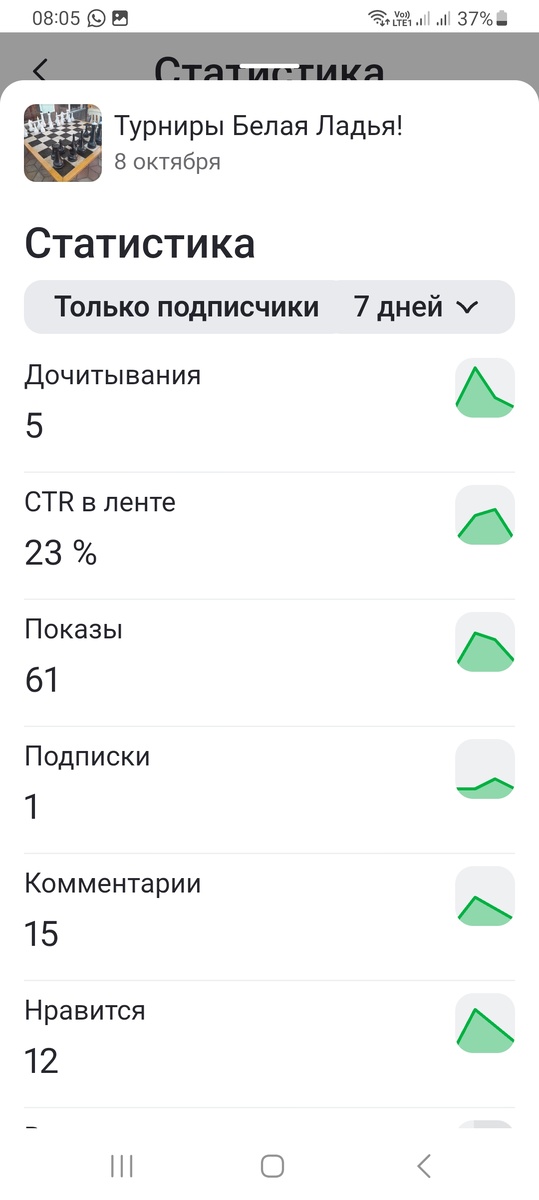 Друзья, у меня на канале есть статья про шахматный клуб Белая Ладья. Опубликована 8 октября 2024 года. Проанализировав её дочитки я ужаснулась!!!!!! Вот скрин. Получается её дочитали 5 человек, при 12 лайков, и 10 написали комментарий, остальные-мои ответы. Глядя на следующий скриншот я ещё более удивилась, посмотрите и вы!!!!!! Комментирую-Темрюкских знаю, Шахты-это Светлана, остальных двоих не вычислила, хотя предположения есть, а где все остальные??????? Друзья,, я в ВАС ни сколько не сомневаюсь!!!!!! Со многими мы прошли здесь уже большой путь, некоторых я знаю лично!!!!!!!Обратите внимание ещё на возраст и пол дочитавших))))), у меня в основном более возрастная категория и преимущественно женская! Никого не хочу обидеть!!!!! Про показы-вообще молчу-61, это при 400 подписчиков. И всё же, очень попрошу всех ВАС, кто прочитал эту статью, заново отозваться, с указанием возраста, пола и места жительства. Буду писать в ТП, пусть расскажут, как так.......... Знаю, что бывают задержки о