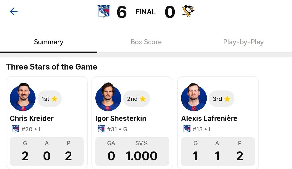 Отклонив предложение «Рейнджерс» о 8-летнем контракте на общую сумму в 88 млн долларов, Игорь Шестеркин продемонстрировал колоссальную уверенность в себе и готовность доказать, что его должны ценить куда больше. И в первом же матче нового сезона российский голкипер ньюйоркцев показал товар лицом, отразив все 29 бросков, что нанесли по его воротам хоккеисты «Питтсбурга». Посмотреть видео НХЛ признала Игоря 2-й звездой встречи с «Пингвинз», завершившейся разгромной победой «Рейнджерс» со счетом 6:0. Так на шикарное выступление Шестеркина отреагировали американские болельщики, оставлявшие свои комментарии в социальной сети X (Twitter). @BMonzoRadio:– Шестеркин начал новый сезон так же здорово, как закончил предыдущий. Игорь иногда бесит и сводит с ума, но он чертовски хорош! @richieisaak:– Все эти эксперты – говорящие головы снова ошиблись, когда рассказывали о том, что разговоры о новом контракте будут отвлекать Шестеркина от хоккея. @rileyt740:– Шестеркин по-прежнему выдает невероятный
