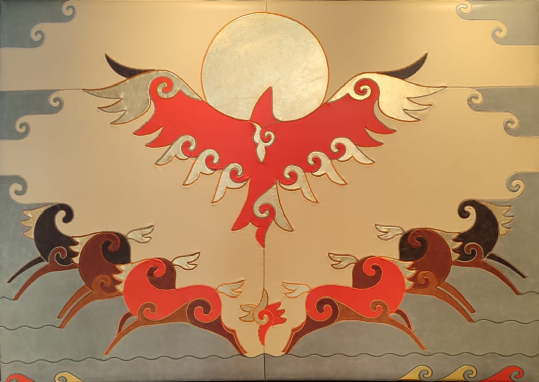 На ипподроме Казани есть музей. Наиле Кумысниковой заказали для музея панно. Она сделала панно на булгарский эпос. Это Симбир Карга летит на Солнце, чтобы спасти людей. А там внизу кони. «Нардуган - пожалуй, самый древний праздник булгар, ведь на нём разыгрывался миф об алпе света и тепла Мардукан-Карге (Нардуган). Согласно мифу, злые духи как-то решили погубить род человеческий и соорудили высокую стену, загородившую Солнце. На земле наступили мрак и холод. Она стала покрываться льдом, а всё живое на ней - гибнуть. На помощь людям пришел добрый див - алп Мардукан-Карга. Он вместе со своими сыновьями Саком и Соком отправился разбивать стену. Лучи близкого солнца стали обжигать их, и тогда Мардукан послал сыновей домой за мёдом, который мог бы предохранить их от ожога. Но Сак и Сок испугались и скрылись в ночи. Карга ждал их некоторое время, а затем в одиночку разбил стену. Так он вернул людям солнце, а значит - свет, тепло, жизнь, радость. Но сам Карга вспыхнул от жара светила. Его гор