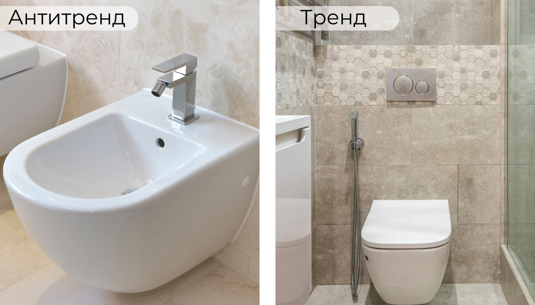 Тренды — явление не постоянное. То, что было модно в один сезон, в другой вполне может потерять актуальность. Ванная давно перестала быть исключительно местом для гигиенических процедур. Это пространство, где мы отдыхаем и расслабляемся после сложного дня. Поэтому оформлению интерьера стоит уделить особенное внимание. Не обязательно гнаться за модными трендами, но знать, что устарело и что делает интерьер не практичным, важно. Разберем подробнее, что стоит избегать при оформлении ванной комнаты и какую альтернативу выбрать. Антитренд. Биде. Вариант отдельно стоящего биде давно изжил себя: занимает немало места и требует дополнительной уборки. Тренд. Гигиенический душ или встроенная в унитаз функция биде станет лучшим решением. Удобно в использовании и не тратит полезную площадь комнаты. Антитренд. «Дворцовый» стиль. Когда-то было модным использовать в дизайне помпезные элементы как показатель роскоши. Сейчас же оформление ванной комнаты не должно пестрить большим количеством узоров, цв