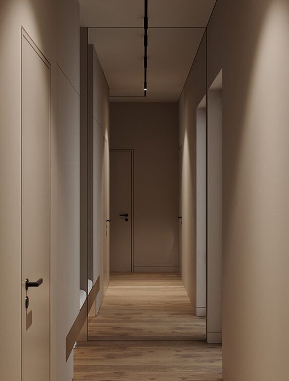 1. Отделка стен •Краска в оформлении стен будет актуальна во все времена. Она легка в уходе и всегда можно перекрасить под настроение или просто освежить. •Декоративная краска, вариант поинтереснее.Она более практична к истиранию, надежна и также легка в уходе •Панели МДФ/ЛДСП/шпон. Идеальны в местах тесного контакта со стенами и в небольших помещениях •И конечно же возможны комбинации, если это вписывается в концепцию дизайна •Обои. Для прихожей стоит выбирать моющиеся варианты (смотрим рекомендации по уходу от производителя). По материалу рекомендую остановить выбор на виниловых (они более прочные, чем флизелин). •Если вы любители крючков для одежды защитить стену от мокрых вещей можно даже керамогранитом 2. Входная дверь и ее проем - места частого касания. Настолько частого, что я расскажу про нюансы отделки в другой статье. 3. Отделка пола •Практичным решением из напольных покрытий в прихожей будет керамогранит. Не обязательно его выкладывать во всем коридоре, можно выделить только