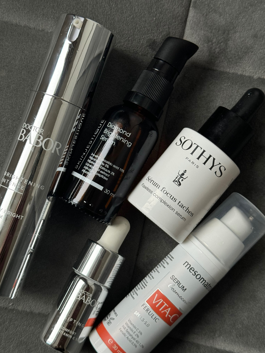В моем уходе практически всегда есть средства с витамином С. Чем он полезен и на что способен? Витамин С - это антиоксидант, который устраняет последствия повреждений, вызванных ультрафиолетовым излучением, он работает с тоном кожи, выравнивает его, устраняет гиперпигментацию, дарит коже красивое сияние. Единственный момент, если у вас чувствительная кожа, то вводить витамин С нужно аккуратно. Но это в целом касается любых активов. Витамин С можно и нужно использовать и в утренней, и в вечерней рутине. Но лучше всего он работает именно утром и в комбинации с солнцезащитными кремами. Если санскрины отражают солнечные лучи и защищают кожу от повреждений, то антиоксиданты (витамин С в частности) помогают снизить риск ожога. Уход с витамином С у меня был в огромном количестве в самых разных средствах и формах: от умывалок и тоников до кремов и масок. Но самый самой любимый формат - это сыворотки. Поэтому сегодня про них. Мой личный топ - 5 сывороток с витамином С: 1.Осветляющая сывор