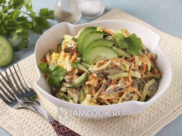 Этот салат — просто находка! Бюджетный, вкусный😋 и готовится очень просто. При этом салат получается сытным, но не тяжёлым, с секретным ингредиентом, который заставит всех гадать: "А что же там такое?" 😉 Даже самые привередливые ели этот салат с большим удовольствием! Сохраняйте рецепт, чтобы в нужный момент воспользоваться. 👩🍳КАК ГОТОВИМ: 1. Сердечки — основа нашего шедевра: - Промываем хорошенько - Чистим от лишнего (знаете, эти жилочки) - Варим в подсоленной водичке 35-40 минут Хозяйке на заметку: бульон не выливайте — пригодится для супчика! 2. Лучок: - Режем полукольцами - Маринуем в ложечке уксуса с щепоткой соли и сахара Секретик: если лук уж очень злой — ошпарьте его кипяточком! 3. Нарезка (самое приятное): - Огурчик соломкой - Ананасы такой же соломкой - Сердечки, когда остынут, тоже соломкой 4. Собираем наш шедевр: - В салатник складываем морковку по-корейски - Добавляем огурцы, ананасы, лучок - Сверху — наши сердечки - Петрушку измельчаем и туда же - Заправляем майонезо