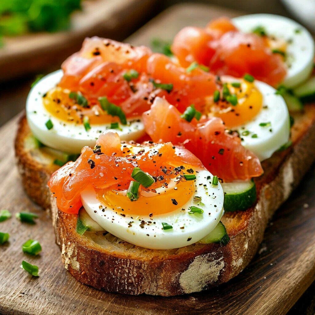 Яйца отварите вкрутую, остудите, очистите и нарежьте кружочками. Огурец нарежьте тонкими кружками. Лук мелко нарежьте. Смешайте сметану с солью и перцем. Нарежьте багет и обжарьте на сковороде до золотистого цвета. Выложите на хлеб яичные кружочки, сверху выложите огурец, лук и рыбу. Полейте сметаной. Приятного аппетита! Ингредиенты 4 яйца 1 огурец 3-4 зеленого лука 1 ст. л. сметаны Соль, перец — по вкусу Соленая красная рыба (по выбору) Багет Готовим с любовью