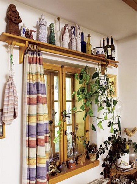 Полка над окошком позволяет сэкономить место и создать интересный акцент. На нее можно поставить не только безделушки, но и посуду, книги. Полки делаются не только над окнами, но и над дверьми.
