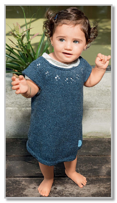 Платье из хлопковой пряжи с ажурной полосой. Вяжется сверху вниз с кокетки, и далее на круговых спицах. К подолу можно приклеить или пришить аппликацию. По кокетке получается вырез и застежка на пуговку.