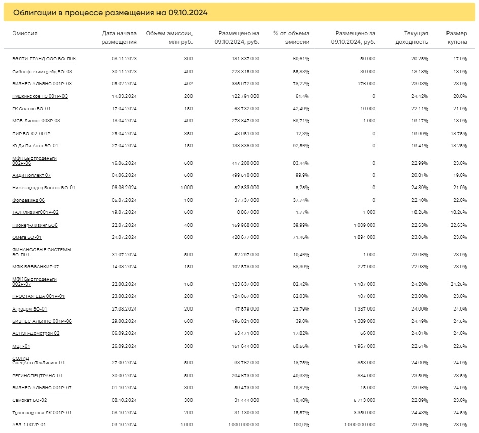9 октября стартовало размещение АБЗ-1 002Р-01. Выпуск объемом 1 млрд рублей был размещен в первый день торгов за 2 120 сделок, средняя заявка 471 698,1 рублей. Суммарный объем торгов в основном режиме по 456 выпускам составил 1062,4 млн рублей, средневзвешенная доходность — 20,64%. 📊 Подробнее в ВДОграфе Больше актуальных новостей читайте оперативно в нашем телеграм-канале
