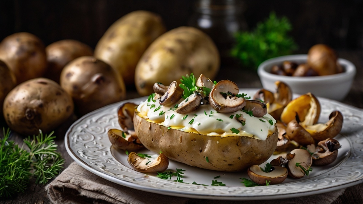 1. Картофель отварить. Смешать размягченное сливочное масло с натертым сыром, мелко порезанными грибами, сметаной и специями.