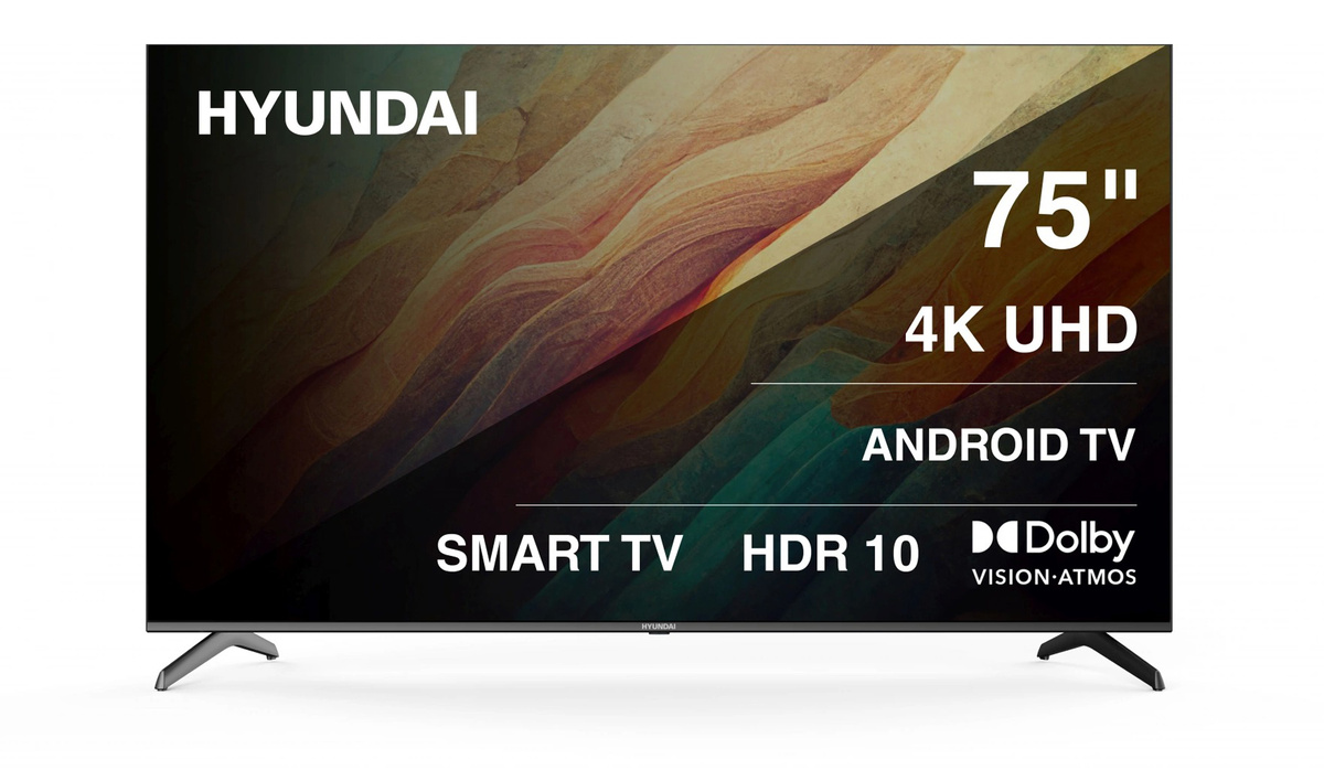 Модель Hyundai H-LED75BU7009 Диагональ экрана 75 дюймов Процессор изображения Mali G52 MP2 Разрешение 4K Ultra HD 3840 x 2160 пикселей Соотношение сторон 16:9 Максимальная яркость 350 кд/м2 Контрастность 6000:1 Углы обзора по горизонтали и вертикали 178 градусов Время отклика 6,5 мс Частота обновления 60 Гц Звук Динамики 2x 10 Вт, Dolby Atmos Платформа Smart TV Android TV 11 Поддержка цифрового ТВ DVB-C, DVB-S, DVB-S2, DVB-T, DVB-T2 Разъемы и интерфейсы Антенный вход x2, Ethernet RJ-45, 2х USB, 4х HDMI, композитный разъем, CI+/PCMCIA, разъем для наушников, S/PDIF Беспроводные интерфейсы Bluetooth 5.0, Wi-Fi Размеры без подставки 1672,9 x 958,5 x 96,7 мм Масса без подставки/ с подставкой 24,5/25,5 кг Цена От 74 000 рублей Первое, что сразу хочется отметить у телевизора Hyundai H-LED75BU7009 — это, конечно, его размер. Диагональ устройства составляет 75 дюймов, то есть 190 см — это примерно 1 метр в высоту и 1,67 метра в длину. На стене такой телевизор с
