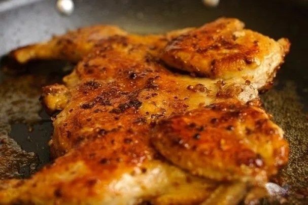Я любитель рецептов из советского времени.Рецепт цыпленка-табака не стал исключением-это очень старый рецепт. Прежде чем начать готовку,хочу вас научить делать чесночный соус(он нам пригодится).Для приготовления соуса потребуется:3-4 дольки чеснока(их нужно растолочь),залить горячим куриным бульоном(1/2 стакана)после этого дать настояться 2-3 часа. А пока готовится чесночный соус,начнем готовит нашего цыпленка. На 4 порции нам потребуется:цыплята 2 штуки не очень крупных,8 долек чеснока,топленое масло 5 столовых ложек,помидор свежий 4 штуки,зеленый лук 100 грамм,чесночный соус 10-12 столовых ложек (соль,перец,укроп,петрушку добавляем по вкусу). Потрошенные и помытые тушки разрезаем вдоль грудки,развернуть по надрезу,хорошо просушить. После того как тушки высохнут,хорошо натереть со всех сторон растертым чесноком,посыпать солью,перцем и выложить на хорошо разогретую сковороду смазанную маслом,накрыть крышкой.Положить на крышку груз.Жарить на среднем огне 20-30 минут.Как только с одной с