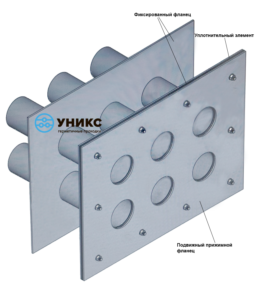 Самая интересная часть нашей работы – разработка индивидуальных технических решений для заказчика. В данном случае был разработан вариант закладной гильзы Уникс-6200 с фиксированным и подвижным прижимным фланцами. Гильза закладывается в фундамент перед заливкой. Фиксированный внутренний фланец позволяет избежать необходимости бурения отверстия под трубу или кабель в фундаменте, что повышает прочность конструкции. Внешний прижимной фланец с уплотнительным элементом предназначен для дополнительной фиксации поверхностного гидроизоляционного материала, например, гидроизоляционных мембран, цементных или битумных материалов и т.д. В сочетании с уплотнительными модулями Уникс такая конструкция обеспечивает надежную гидроизоляцию. После установки не требуется дополнительного периодического обслуживания и остается возможность быстрой замены или ремонта труб.