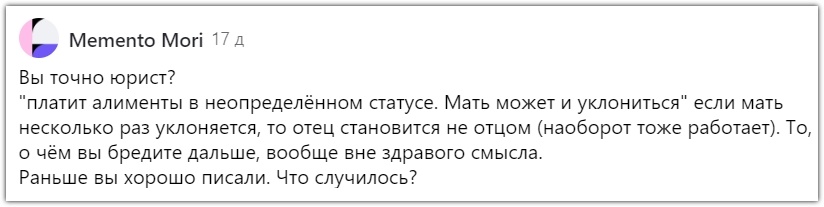 Однажды один товарищ не понял: как мужчина может платить алименты "в неопределённом статусе", пока мать уклоняется от экспертизы ДНК ребёнка. Тех, кто понял - обозвал обидными словами на Д и сказал, что раз он понять не может, то я пишу для этих самых Д.