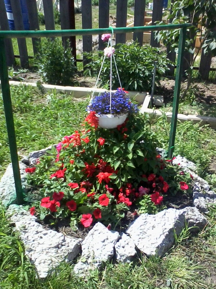 Насмотревшись фото дачников, мне захотелось соорудить очередную клумбу. На этот раз круглую в виде костра огненного. Предполагалось, что рядом с клумбой должна встать беседка, от который мы в дальнейшем отказались. Думалось, что цветник будет для посадки однолетних растений, но позднее мнение изменилось. Первоначально на данном участке лежали кучи мусора и глины, выкопанной из колодца. Смотрите галерею. Когда пришло время облагораживать участок, я расчистила место, раскопала землю под цветник, огородила бордюрной лентой и выложила бетонные сколы, оставшиеся после строительства дачного домика. Природных камней в нашей местности нет, только покупные или привозные с Урала. В ПЕРВЫЙ ГОД ЗАДУМКА УДАЛАСЬ. По краям посадила петунью красную, в середину сальвию высотой 50-60 см. В подвесном кашпо синюю лобелию, чтобы издалека бросалась в глаза. С тех пор, на протяжении нескольких лет в клумбу высаживались цветы-однолетки, но красивой композиции никак не получалось. А я продолжала экспериментиро