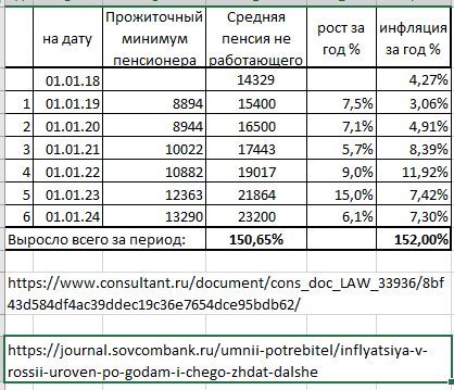 Сравним цифры, отражающие ситуацию до и после реформы. Видите в таблице реальный рост? Средняя пенсия не работающих с учётом официальной инфляции не изменилась. Работающим по сей день не выплачивают то, что им положено... Прожиточный минимум удручает.