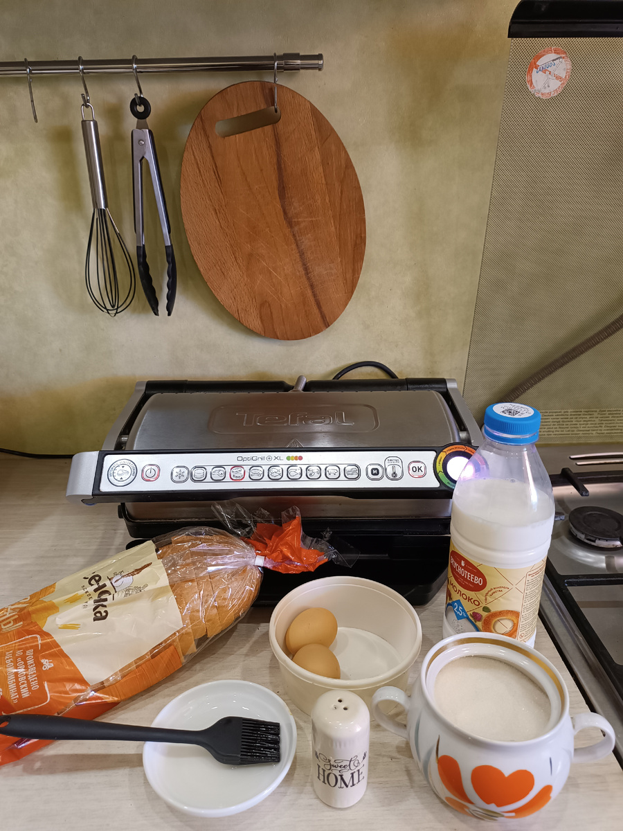 Пока гриль нагревается, готовлю смесь, в которую надо будет обмакивать батон. Смешиваю яйца, сахар,соль, затем добавляю молоко. Перемешиваю , используя венчик. Батон в жидкость обмакиваю и тут же вытаскиваю, чтобы он не начал разваливаться.