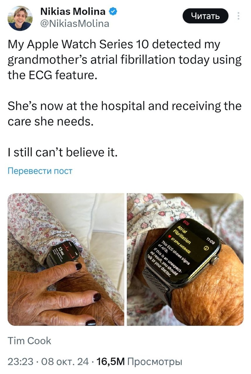 Новейшая модель Apple Watch Series 10 стала настоящим спасением для многих пользователей, среди которых оказалась и бабушка одной девушки. Как оказалось, благодаря функции электрокардиограммы (ЭКГ) на умных часах удалось выявить серьезное заболевание сердца - мерцательную аритмию. Девушка поделилась своим рассказом в социальных сетях, где его увидело уже более 16 миллионов человек. Оказывается, что ЭКГ на Apple Watch Series 10 обнаружило аритмию у бабушки задолго до того, как это смогли установить врачи. Благодаря этому успело предпринять своевременное лечение, что позволило предотвратить серьезные осложнения и спасти жизнь пожилой женщине. Реакция пользователей в соцсетях была поразительной - многие выразили свои восторги и благодарность компании Apple за такие инновационные и полезные функции на их продукции. Один из парней поделился своим опытом, рассказав, что даже в больнице оборудование не смогло обнаружить проблему, но Apple Watch отправило уведомление, которое позволило вовр
