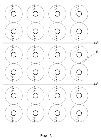 Атомы сгруппировались попарно, «соприкоснувшись» в точке Б. Пары выстроились в строгую структуру, образуя «коридоры», в которых вращение всех атомов направлено в одну сторону. При этом, в точке Б электрон с орбиты одного атома «перескакивает» на орбиту другого, потом назад, двигаясь «по восьмёрке» и фиксируя сложившуюся структуру. В образовавшихся «коридорах» направление вращения всех атомов совпадает, что приводит в движение межатомную среду в направлении А. Способность вещества выстраивать подобную структуру атомов под действием движущейся среды (направление А) позволяет веществу взаимодействовать с магнитным полем. А способность вещества сохранять данную структуру атомов позволяет веществу самостоятельно приводить в движение межатомную среду (направление А), то есть самостоятельно создавать магнитное поле, то есть быть постоянным магнитом. Таким образом, магнит создаёт направленное движение среды внутри себя. И это про магнит всё. Далее, снаружи магнита, «работает» среда и всё, что там происходит, зависит от свойств среды.