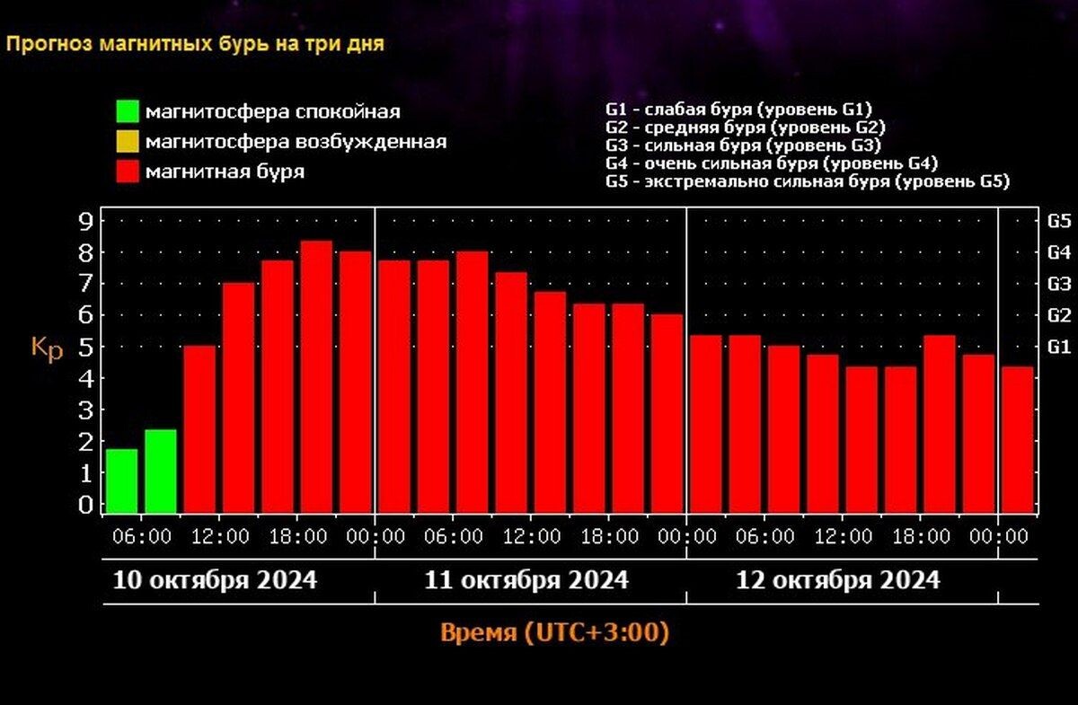 С 10 октября на Землю обрушатся очень сильные магнитные бури, которые в свой пиковый период достигнут класса G4. Об этом сообщил метеоролог Михаил Леус. По словам специалиста, к Земле движется массивное облако плазмы, которое достигнет Земли уже во второй половине дня 10 октября. "Начало возмущений магнитосферы Земли ожидается сегодня, около полудня, и продлятся магнитные бури, с колебаниями интенсивности в диапазоне от средней до очень сильной, G2-G4, до конца суток пятницы, 11 октября. В субботу магнитные бури продолжатся, но уже менее интенсивными, слабого и среднего уровня, классов G1-2G. И только в воскресенье возмущения геомагнитного поля будут ослабевать и прекращаться", - написал синоптик в своём тг-канале. Напомним, что ранее Михаил Леус также предупреждал о надвигающихся магнитных бурях 4-6 октября.
