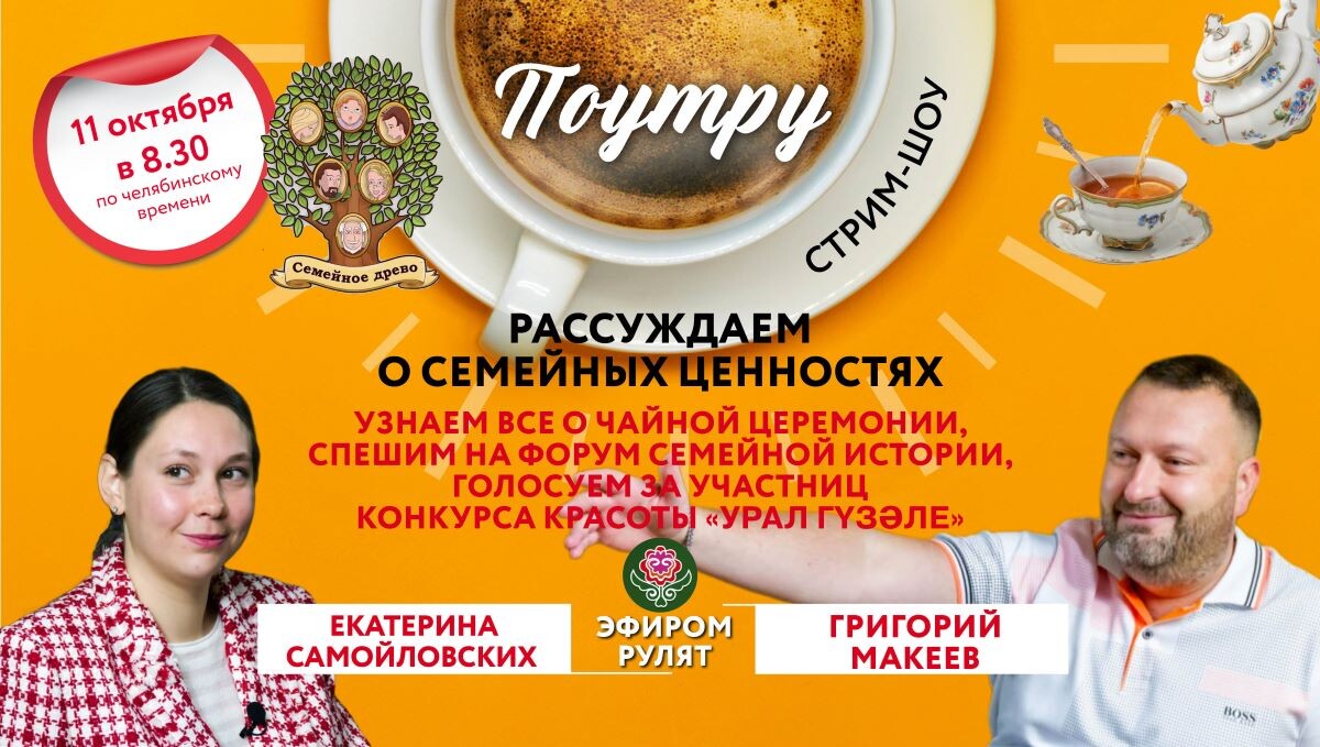 Завтра, 11 октября, в гости к ведущим Григорию Макееву и Екатерине Самойловских придут Ася Тихомирова, старший научный сотрудник, хранитель фонда графики Музеев Московского Кремля, и Елена Петрова, заведующая сектором художественных коллекций ГИМ ЮУ. Они расскажут про новую выставку, которая совсем скоро откроется в Историческом музее Южного Урала, Четыре столетия русского чая. Великий дар Поднебесной». Из столицы в Челябинск прибыли не только удивительные экспонаты, но и связанные с ними истории о семейных традиция. В последние годы интерес к истории своей семьи заметно возрос. Все больше россиян начинают искать информацию про своих пра-пра-прабабушках и пра-пра-прадедушках, а иногда и копают еще дальше. Юлия Кириенко и Алёна Низамеева, исследователи семейной истории, расскажут в эфире «Поутру», с чем связан такой всплеск интереса, а заодно предстоящий Форум семейной истории «Нескучные Потомки». Также гостями эфира на «Гранада ТВ» станут Луиза Зарипова, автор конкурса красоты и традиц