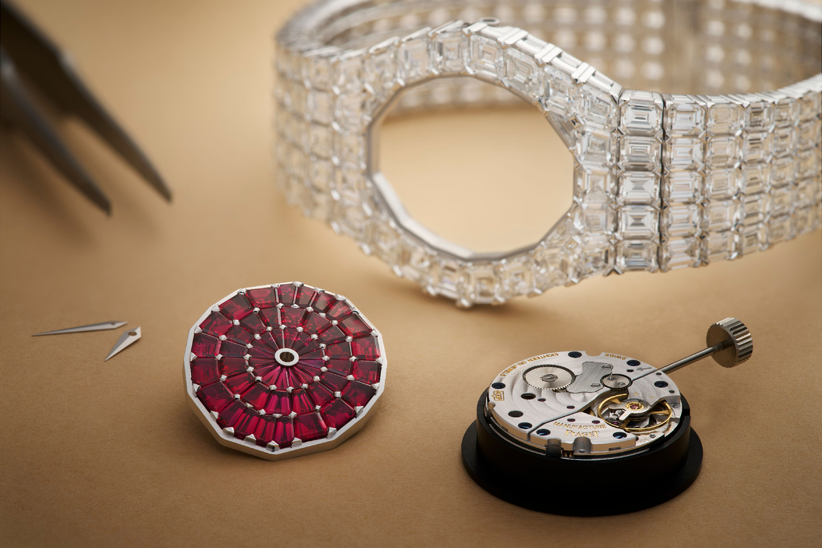 Апрельская новинка, выпушенная к 35-летию модели Piaget Aura. Исторический прототип часов отличался корпусом и браслетом, которые были целиком покрыты бриллиантами. То же самое мы наблюдаем и здесь: корпус из белого золота и браслет модели покрыты бриллиантами изумрудной огранки, а для красивого контраста циферблат инкрустирован отборными рубинами. Часы изготовлены в единственном экземпляре. Стоимость модели составляет CHF1,670,000.