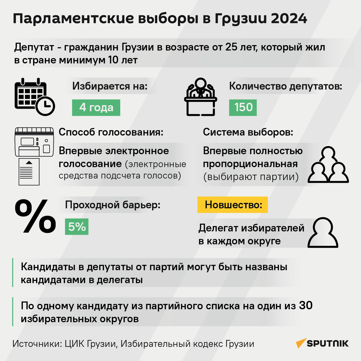 Парламентские выборы назначены в Грузии на 26 октября. Они впервые пройдут только по пропорциональной системе (по партийным спискам) и масштабно с использованием электронных технологий – аппаратов верификации и подсчета голосов. На этот раз участвовать в выборах могут только партии и никаких блоков. В этой ситуации оппозиционные объединения нашли выход - партии-лидеры в коалициях официально переименовались и вписали партнеров в свой партийный список. Проходной барьер на предстоящих парламентских выборах 5%. Голосование в стране пройдет на более чем 3 тысячах участков.