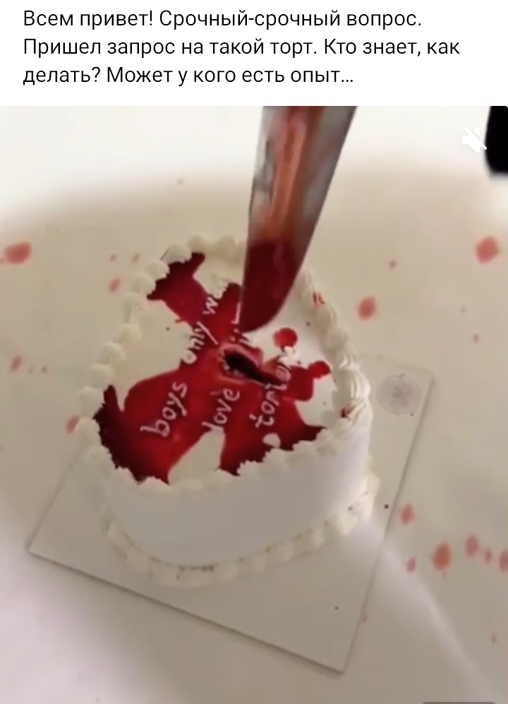 Суть в том, что заказчик хочет, чтобы при втыкания ножа в торт оттуда брызнула имитация крови: Не спешите фукать. Это трендовый торт - тренд задала Тейлор Сфивт в своем клипе, типа сердце кровью обливается. А молодежи зашло, им прикольно. И на Хэллоуин торт пойдет. Воздушный шарик синего цвета (не красного,чтобы не сливался!!!) надували,варили сироп из клубники и глюкозы,наполняли шарик и закручивали,чтоб создать давление. Ямку в торте,туда шарик и сверху финишное покрытие. Нужно смотреть на размер торта и шарика,чтобы он не был сильно большим или маленьким. И ещё пара советов: И небольшой мастер класс с просторов интернета: 🍡🍡🍡🍡🍡🍡🍡🍡🍡🍡🍡🍡🍡🍡