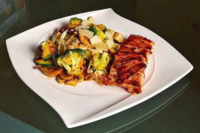 Общее время около 27 минут. Промойте лосося, обсушите и полностью оберните беконом. Очистите/вымойте и нарежьте брокколи, грибы, лук и кабачки.