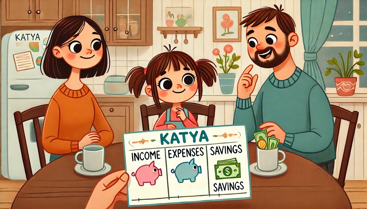 Прошло несколько месяцев с тех пор, как Катя открыла свой первый сберегательный счет в банке. Однажды вечером, когда вся семья собралась за ужином, папа предложил Кате научиться составлять бюджет — интересный способ управлять её деньгами. — Катюша, а как насчёт того, чтобы научиться составлять бюджет? — с улыбкой спросил папа. — Бюджет? Что это такое? — удивилась Катя. — Это план, который помогает понять, сколько у тебя есть денег и как их лучше использовать, чтобы не тратить слишком много, а откладывать на то, что для тебя важно, — объяснил папа. Катя заинтересовалась и спросила: — Это как когда я копила на медведя? — Совершенно верно, — ответил папа. — Но теперь мы сделаем это ещё интереснее! Мы будем записывать все доходы и расходы, чтобы увидеть, куда уходят твои деньги и как быстрее накопить на твою мечту — поездку в парк аттракционов. Катя была в восторге от этой идеи. Они вместе с папой взяли листок бумаги и разделили его на три части. Папа объяснил, что это будет как три волшеб