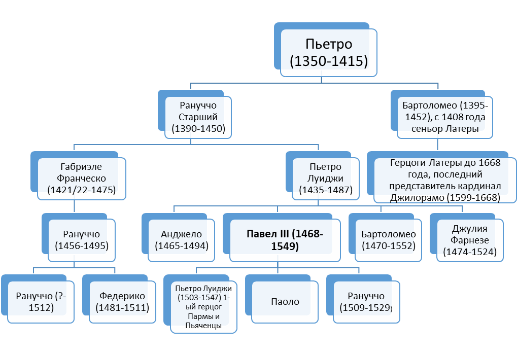 Что же посмотрим на генеалогию герцогов, потомков понтифика, сосредоточившись большей частью на последних поколениях. Как видим, с преемственностью в течении первых пяти передач власти у Фарнезе было всё гладко (почти, если не считать одного конфликта), вот на внешних фронтах всегда было туго с самого начала. Герцогство было создано как вассал Папы и формально продолжало оставаться таковым еще в начале XVIII века, пока Папское государство окончательно не ослабело. Приходилось лавировать между Францией и, с известного времени объединившимися Испанией и Империей, в довесок не забывать, конечно, про склочный Святой Престол.